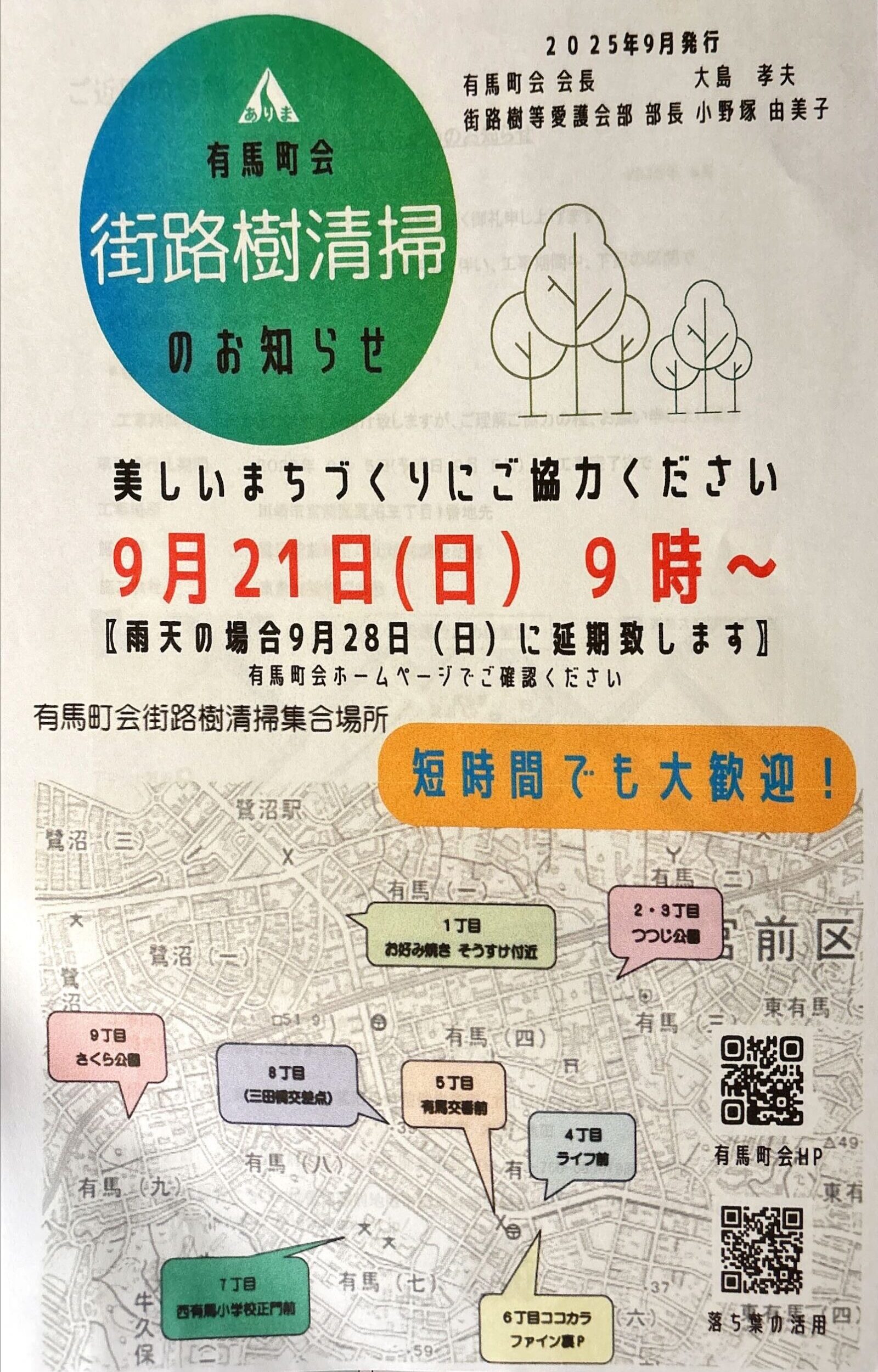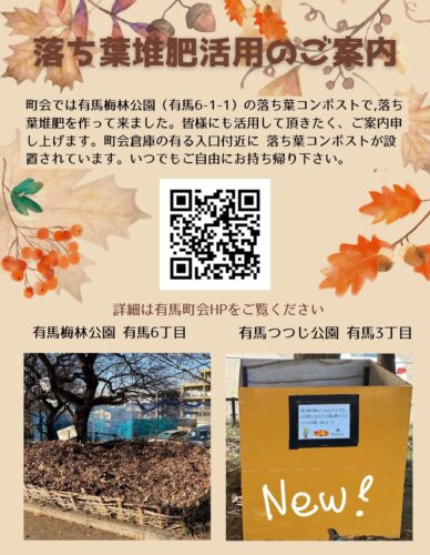 街路樹清掃のお知らせ お知らせ 2025.09.01 美しいまちづくりにご協力ください。 集めた落ち葉の一部は堆肥にして活用しています。 また 落ち葉堆肥の活用をご案内しています。 宮前郵便局花壇でも落ち葉堆肥を活用しています。 閲覧数: 158
