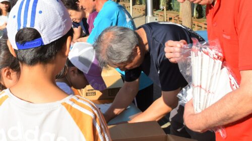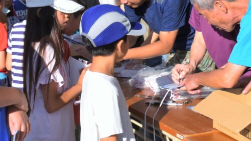 スタンプが押されたカードを手に笑顔が集まつて来ました。役員の皆さんから一人ずつに、参加賞が手渡れました。子どもたちの嬉しそうな表情が印象的でした。