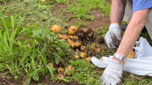 慎重に土を掘り起こしていると、手にじゃがいもの感触!